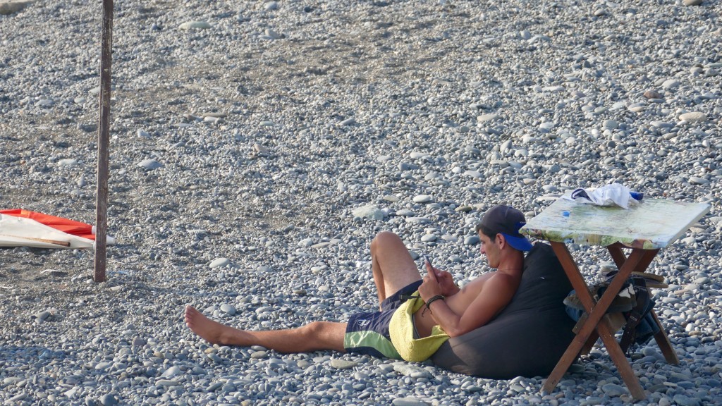 La sensación de entrar en un país menos religioso, menos dogmático, me llena con una sensación liberadora. Tal vez de prepo, la primera acción al pasar la frontera y pisar territorio Georgiano es la de pedirme una cerveza en un chiringuito al costado de la ruta y gozar la misma sentado en una vereda, inobservado en medio de mucha gente vistiendo poca ropa y mostrando mucha piel, actitud tipica para una zona de veraneo. No tengo necesidad alcuna de cerveza ni de tomar alcohol pero si necesito la libertad para decidir libremente lo que deseo y lo que no.