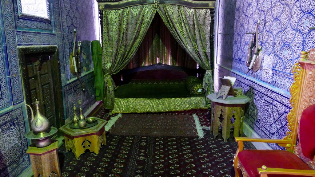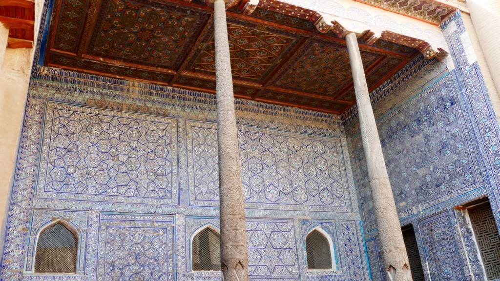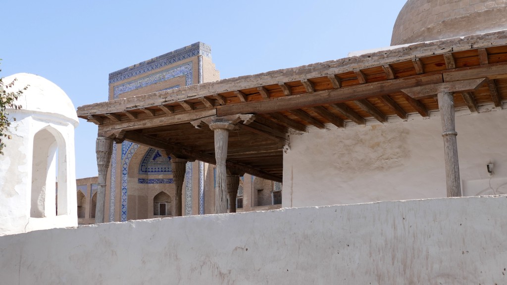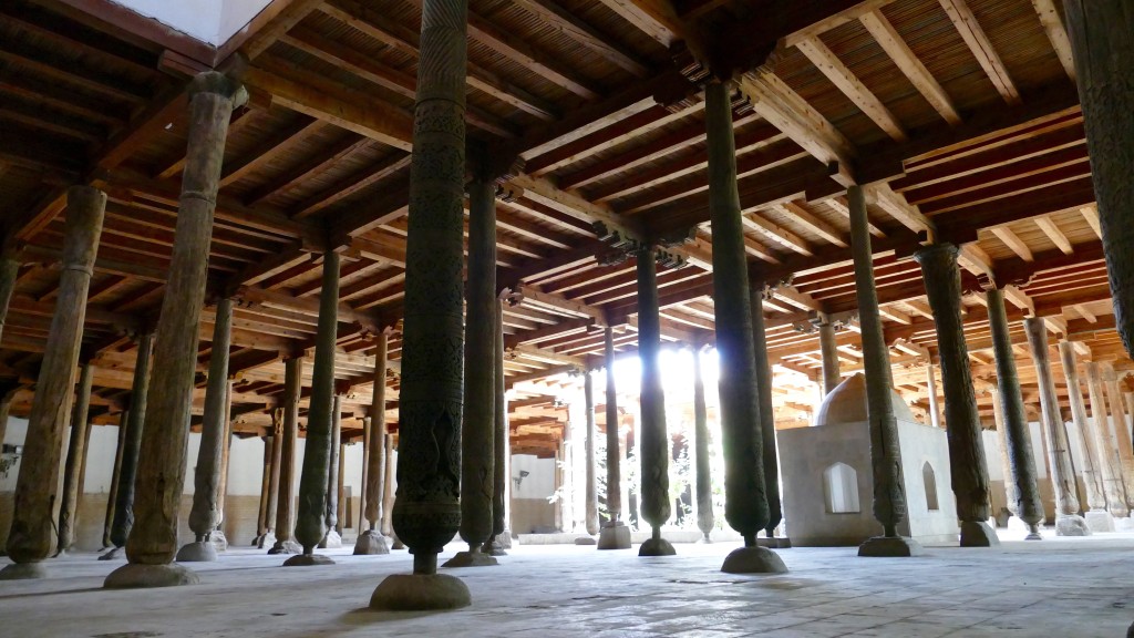 Juma Mosque. The old mosque was already mentioned by the Arab traveller Mohammed al-Magisi in the 10th cent. According to the inscriptions above the entrance the actual mosque was built in the 18th cent. It covers an area of 55 x 46 m. The interior is square in plan. It has two octogonal openings in the ceiling. Apart from wooden beams and columns it has no decoration. It contains 212 ornately carved columns that support the roof, dating back to the 12th to 15th century.Khiva – The old town Ichon-Qala (Itchan Kala)a bedroom of that times.wooden roofs at Ichon-Qala (Itchan Kala) Khiva.