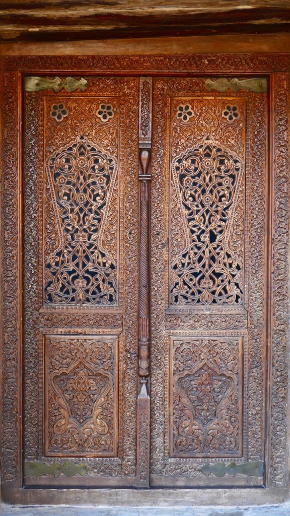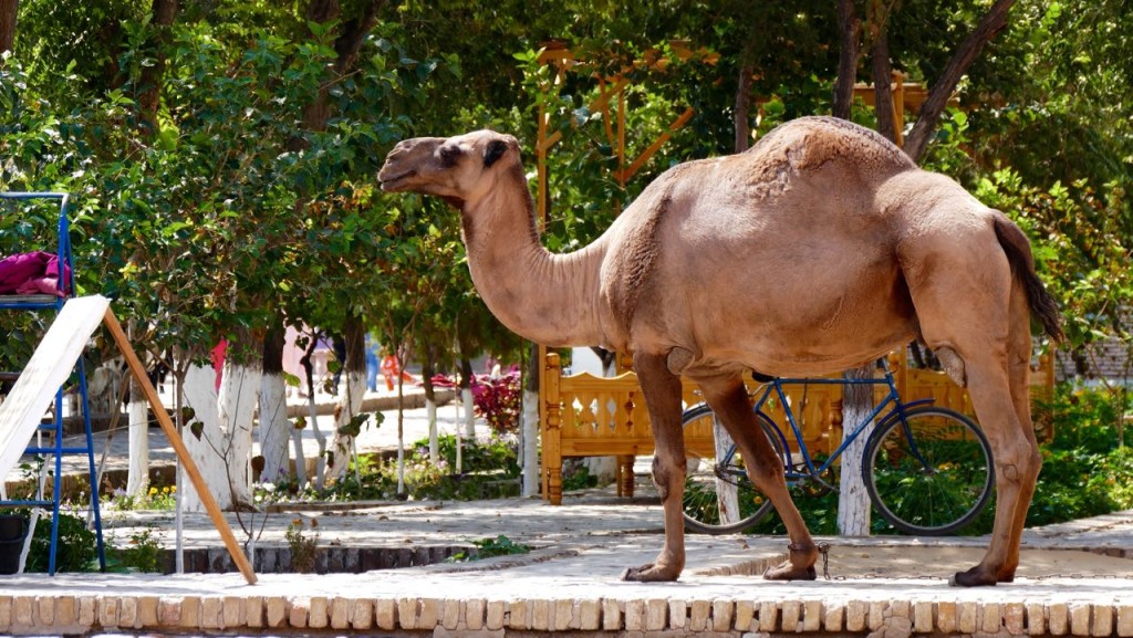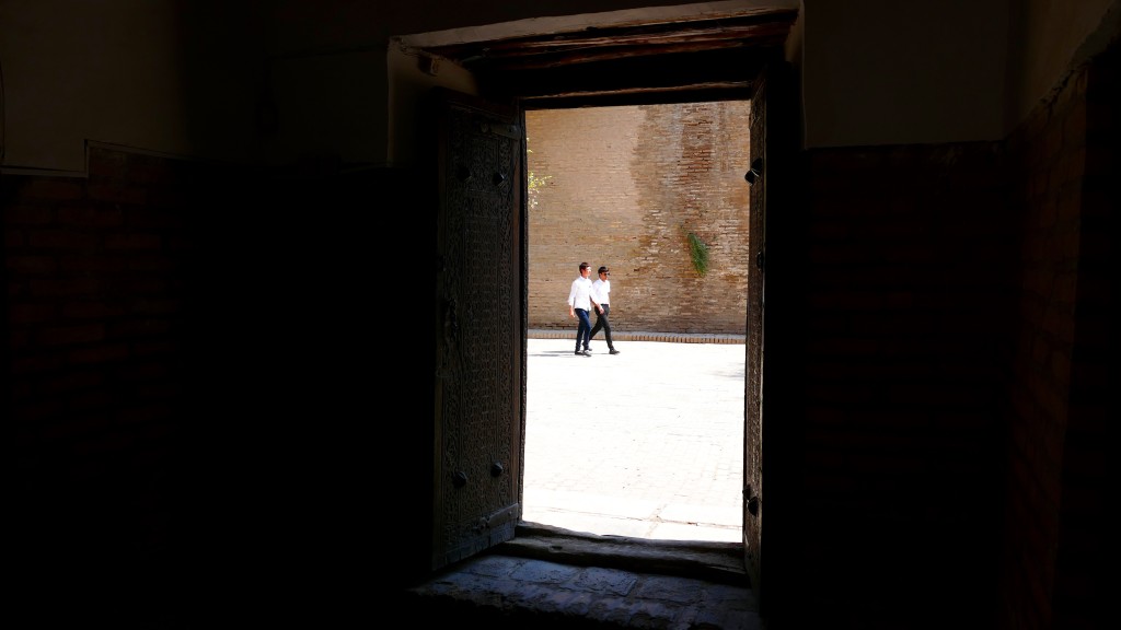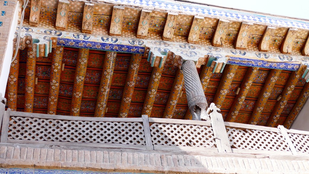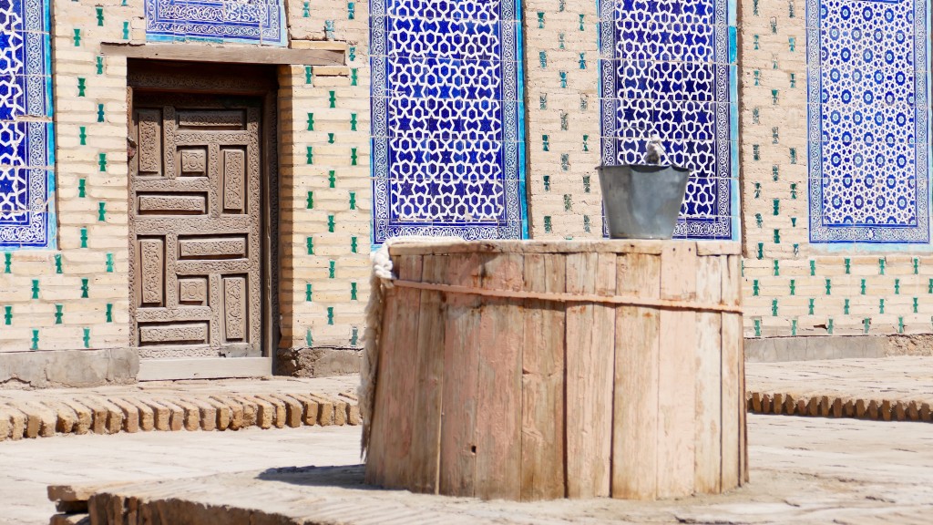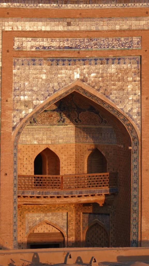 the well at Ichon-Qala (Itchan Kala) Khiva.The columns are masterpieces of wood carving. The whole surface is covered by leaves, flowers and tendrils. If you watch cloisels you can see pomegrenates blossoms and acanthus leaves. The columns are peculiar in form: they are spherical at their base, get a little bit narrower and end with a part similar to an oblong drinking glass. In some columns the base is a square marble or a round piece of wood only.passersbyAs Islam spread to the area, the first major structures were built near Shem’s well, and it became known as a small trading post on the Silk Road. First written sources date from the 10th century. The Arab traveller Al Istachri mentions Khiva in his enumeration of the most important settlements in Chorezm. The Arab geographer Ibn Battuta visited Khiva in the 14th century.Kalta Minor. This squat minaret is an iconic symbol of Khiva, mainly because of it’s exquisite blue and green tile work and the fact that it remains unfinished. It was originally supposed to rival the Kalon Minaret in Bukhara, however the architect fled before seeing it finished, fearing he would be put to death by the khan.