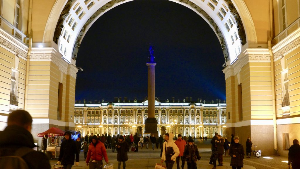 Scheidung die sie dazu bewog wieder in ihre Heimat zurück zu kehren, vielmehr das Bedürfnis wieder daheim zu sein, ganz gleich ob es im Jahr auf knappe 70 Sonnentage reicht. Wir waren mit dicker Kleidung und Wollmütze bedeckt, gleich wie alle anderen Passanten der Nevsky Prospekt (Nevskiy Avenue) an diesem herbstlichen Vormittag. Olga lobte noch den Tag, trotz Wind und Wolkendecke, denn es war trocken. Ihre Freude galt auch unserer Begegnung. Lang sei es her, sagte sie zu mir, dass sie letztmals einen Fremden begegnete und französisch reden durfte. So begleitete sie mich noch einige Häuserblocks weiter auf meinem Weg. Mit einer Umarmung und Kuss auf die Wange, was hier in Russland nur unter Familienmitglieder oder sehr enge Freunden vorkommt, verabschiedeten wir uns, und ich stieg in den Bus ein, der mich an die Eremitage bringen sollte.