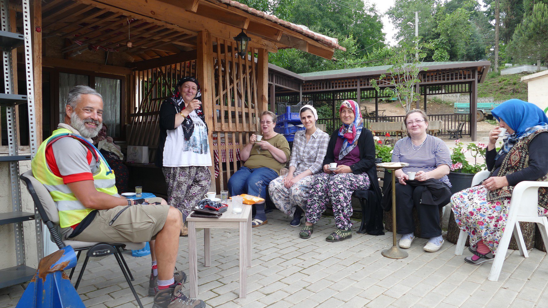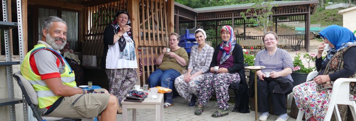 Die zweite Begegnung heute war auch eine besondere. Wie weiter unten auf den Fotos zu sehen ist, ohne es zu ahnen hielt ich, nach einem Cay fragend, in einer Frauen Genossenschaft aus der Ortschaft an, welche verschiedene Sachen anboten. Selbst gebackenes Brot, Marmeladen, Strickwaren und letztlich die Bewirtung eines Saales für besondere Anlässe. Also eine reine „Weiberwirtschaft“ wie sie mir mitteilten. Ich verstand nur „Die Männer haben wir alle weg geschickt“ und den Rest erfuhr ich dank Google Translator. Sie bewirteten mich. Servierten mir Börek, Sarmale, Ayram für den Durst, und zum Abschluss einen türkischen Kaffee.