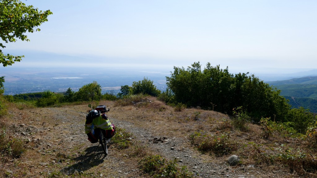 Todo empieza con la partida tardía de Sighnaghi. Mi GPS me manda por un sendero con 16% de bajada. Pero el sendero se lo llevó la lluvia, hace años. Yuyos y pedregal. Vuelvo, cuesta arriba, empujando. Es mas tarde aún y el sol me va quemando. Retomo otro sendero. Parece ser transitable. Llego al valle y pedaleo 60 Kms hasta la frontera con Azerbaijan. Lento, observando , despidiendo y con una extraña sensación de lo que me espera en el país de los Azeris.