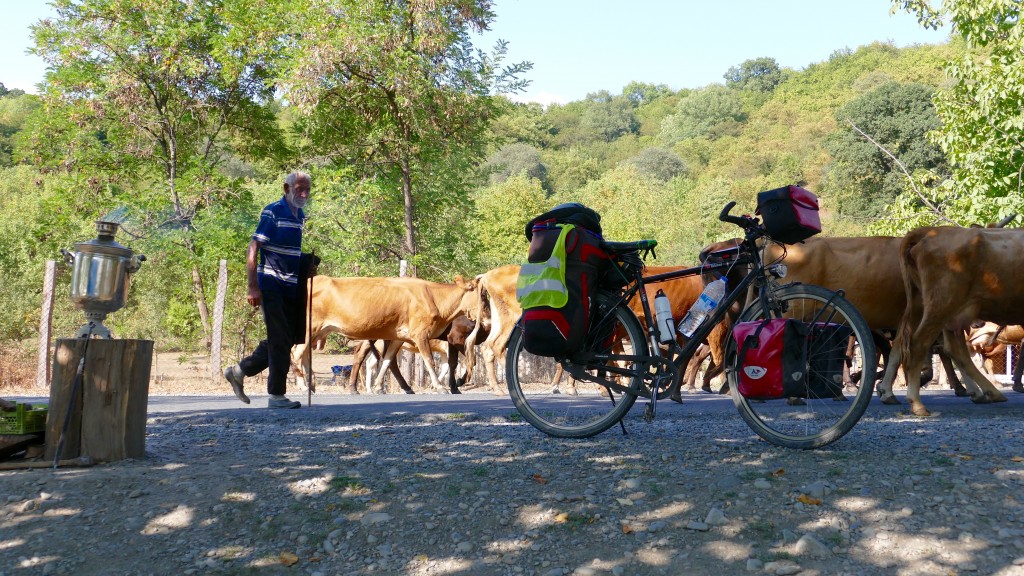 Tengo mi primera colisión del viaje. Aún en Georgia. Viajo por la banquina de una ruta provincial en muy mal estado. Tomo la mano contraria para tener el transito de frente y a la vista. Camión por atrás, Furgoneta por delante. También un ternero en mi banquina. Al cruzarnos los cuatro al mismo momento, el ternero se espanta por mi culpa y salta hacia la ruta. La furgoneta le pega con el costado y el ternero vuela unos metros y me pega a mi. En fracciones de segundo constato que no tengo nada, el ternero se para y sale corriendo para otro lado, y el conductor de la furgoneta ofuscado conmigo, recogiendo su farol, su paragolpes trasero, y puteandome a lo loco mientras yo respondo “Njet Understand” y me pongo a pedalear mas rápido que un huracán.