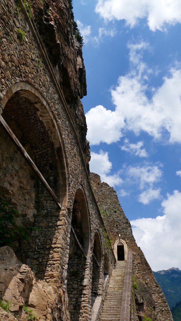 The large aqueduct at the entrance, which supplied water to the Monastery, is constructed against the side of the cliff. The aqueduct has many arches which have mostly been restored.Llegó a su actual forma en el siglo XIV después de ganar importancia durante el reinado de Alejo III (1349-1390) del Imperio de Trebisonda (establecido en 1204). En ese momento, el monasterio fue concedido con un monto anual de los fondos imperiales. Durante la época de Manuel III, el hijo de Alejo III, y durante los reinados de los príncipes posteriores, Sumela adquirió aún más riqueza con las donaciones imperiales. Después de la conquista por el sultán otomano Mehmed II en 1461, se le concedió la protección por orden del sultán y los derechos y privilegios que fueron renovados por los sultanes siguientes. Los monjes y viajeros siguieron visitándolo a través de los años, el monasterio fue muy popular hasta el siglo XIX.