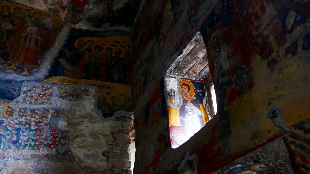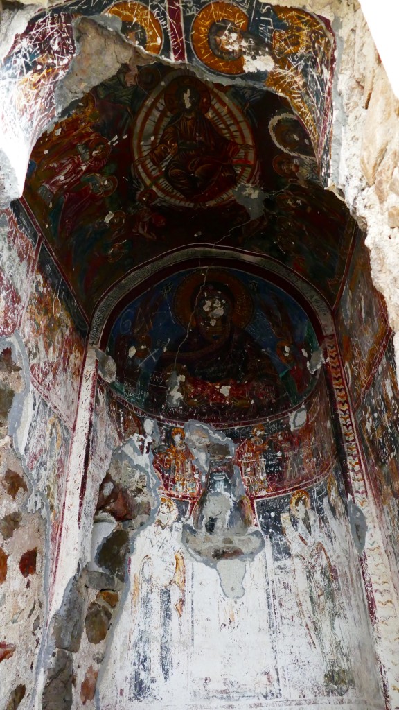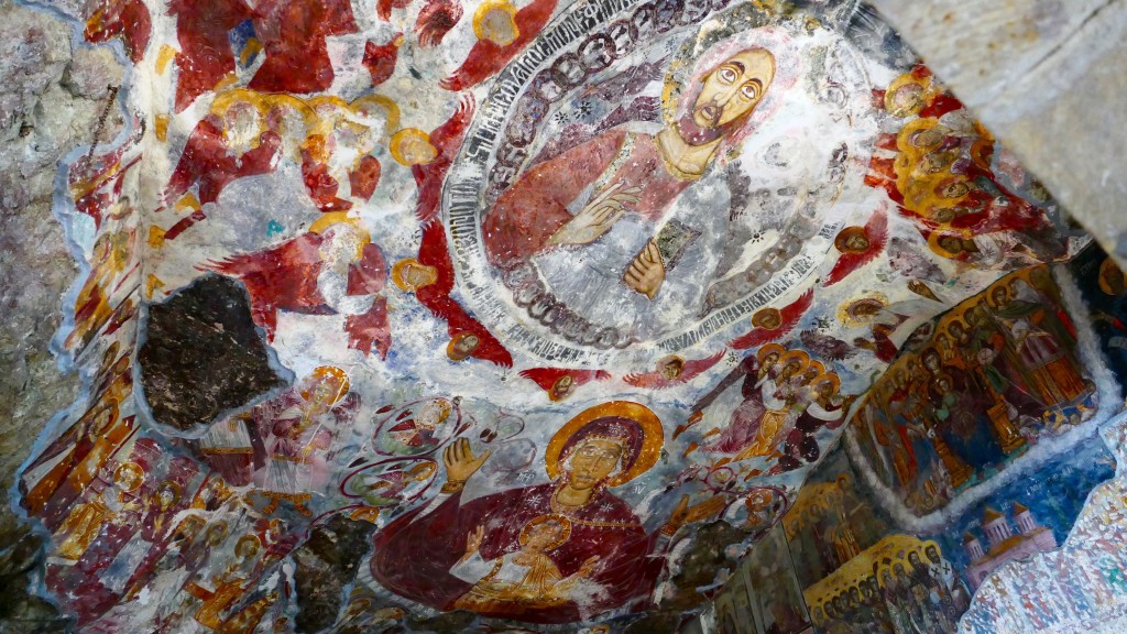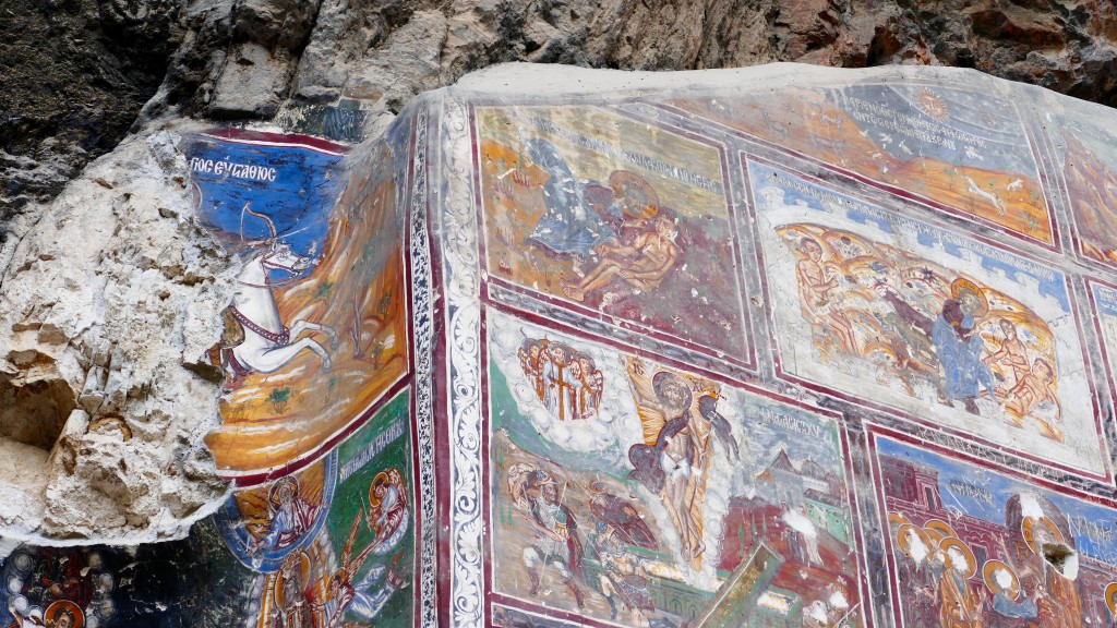 The inner and outer walls of the Rock Church and the walls of the adjacent chapel are decorated with frescoes. Frescoes dating from the era of Alexios III of Trebizond line the inner wall of the Rock Church facing the courtyard. The frescoes of the chapel which were painted on three levels in three different periods are dated to the beginning of the 18th century. The frescoes of the bottom band are of superior quality.