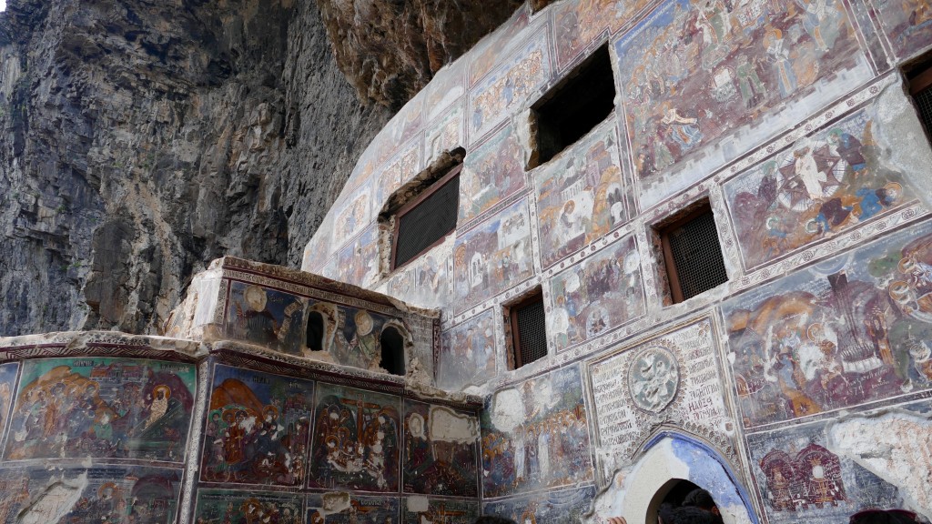 The entrance to the Monastery leads up a long and narrow stairway. There is a guard-room next to the entrance. The stairs lead down from there to the inner courtyard. On the left, in front of a cave, there are several monastery buildings. The cave, which was converted into a church, constitutes the center of the monastery. The library is to the right.The main subject of the frescoes are biblical scenes telling the story of Christ and the Virgin Mary.The main subject of the frescoes are biblical scenes telling the story of Christ and the Virgin Mary.The inner and outer walls of the Rock Church and the walls of the adjacent chapel are decorated with frescoes. Frescoes dating from the era of Alexios III of Trebizond line the inner wall of the Rock Church facing the courtyard. The frescoes of the chapel which were painted on three levels in three different periods are dated to the beginning of the 18th century. The frescoes of the bottom band are of superior quality.The inner and outer walls of the Rock Church and the walls of the adjacent chapel are decorated with frescoes. Frescoes dating from the era of Alexios III of Trebizond line the inner wall of the Rock Church facing the courtyard. The frescoes of the chapel which were painted on three levels in three different periods are dated to the beginning of the 18th century. The frescoes of the bottom band are of superior quality.The entrance to the Monastery leads up a long and narrow stairway. There is a guard-room next to the entrance. The stairs lead down from there to the inner courtyard. On the left, in front of a cave, there are several monastery buildings. The cave, which was converted into a church, constitutes the center of the monastery. The library is to the right.The inner and outer walls of the Rock Church and the walls of the adjacent chapel are decorated with frescoes. Frescoes dating from the era of Alexios III of Trebizond line the inner wall of the Rock Church facing the courtyard. The frescoes of the chapel which were painted on three levels in three different periods are dated to the beginning of the 18th century. The frescoes of the bottom band are of superior quality.The entrance to the Monastery leads up a long and narrow stairway. There is a guard-room next to the entrance. The stairs lead down from there to the inner courtyard. On the left, in front of a cave, there are several monastery buildings. The cave, which was converted into a church, constitutes the center of the monastery. The library is to the right.The entrance to the Monastery leads up a long and narrow stairway. There is a guard-room next to the entrance. The stairs lead down from there to the inner courtyard. On the left, in front of a cave, there are several monastery buildings. The cave, which was converted into a church, constitutes the center of the monastery. The library is to the right.Looking down to the valley.