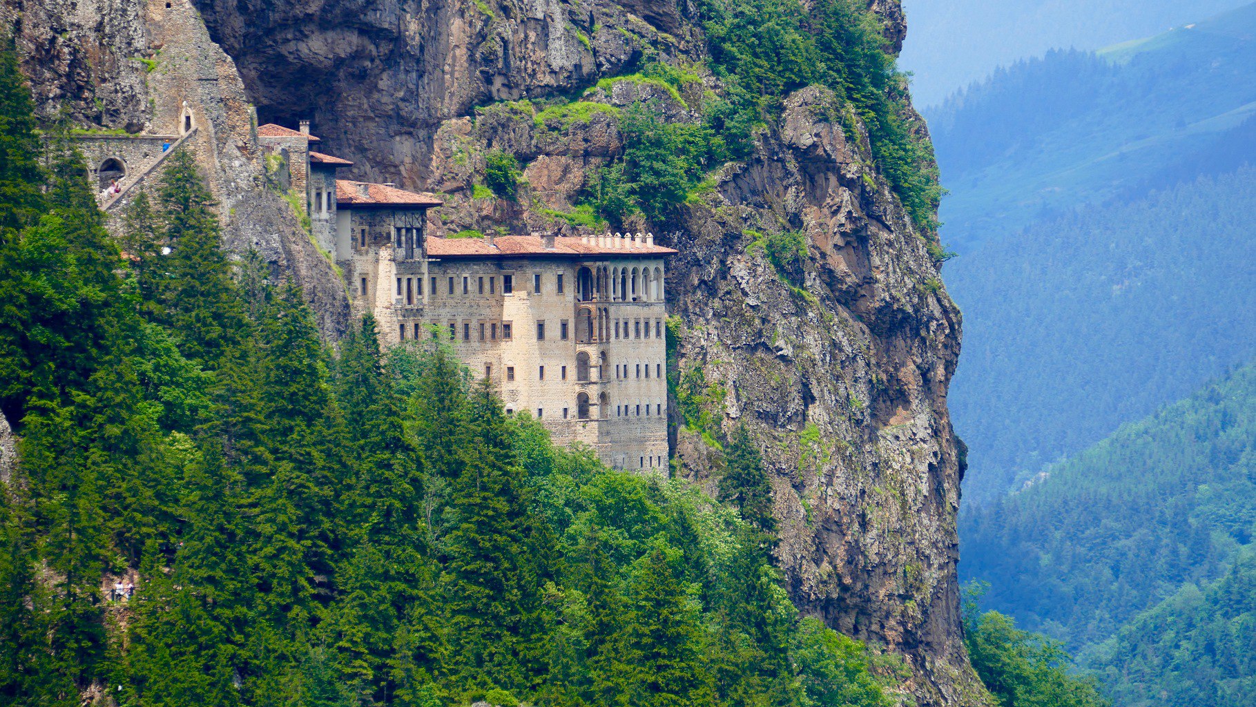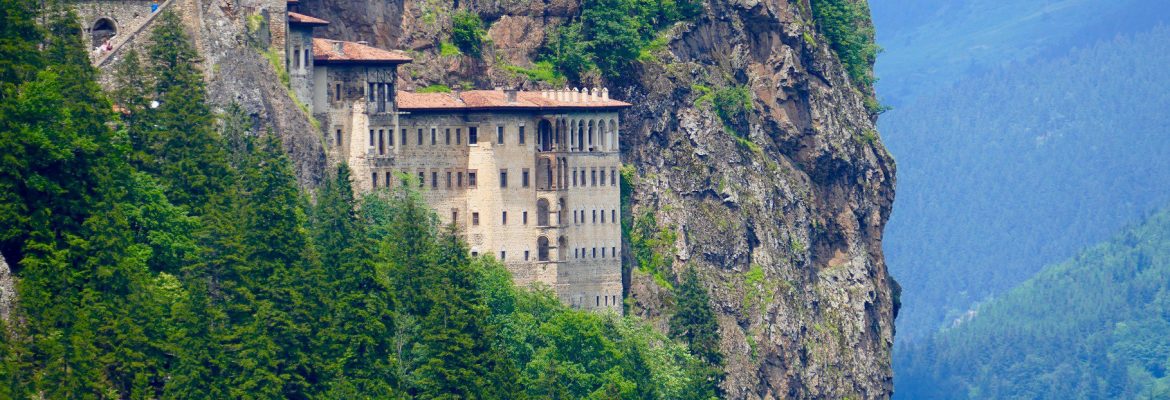 The Sumela Monastery (Turkish: Sümela Manastırı) is a Greek Orthodox monastery dedicated to the Virgin Mary at Melá Mountain within the Pontic Mountains range, in the Maçka district of Trabzon Province in modern Turkey. Nestled in a steep cliff at an altitude of about 1,200 metres (3,900 ft) facing the Altındere valley, it is a site of great historical and cultural significance, as well as a major tourist attraction within Altındere National Park.The principal elements of the Monastery complex are the Rock Church, several chapels, kitchens, student rooms, a guesthouse, a library, and a sacred spring revered by Eastern Orthodox Christians.The large building with a balcony on the front part of the cliff was used for the monks’ cells and for housing guests. It dates from 1840.